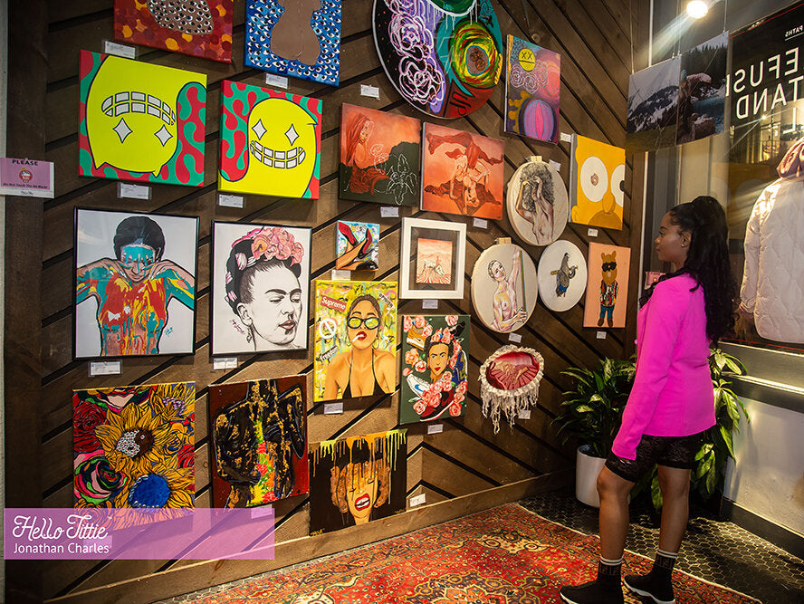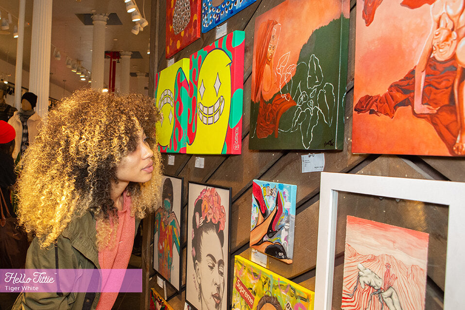 The vibe was celebratory, inclusive, and empowering. Attendees danced, connected with the artists, and won exclusive raffle prizes from Hellotittie and Susan&Me. Toward the end of the night, each featured artist had the opportunity to speak about their work, and several pieces were sold on-site.